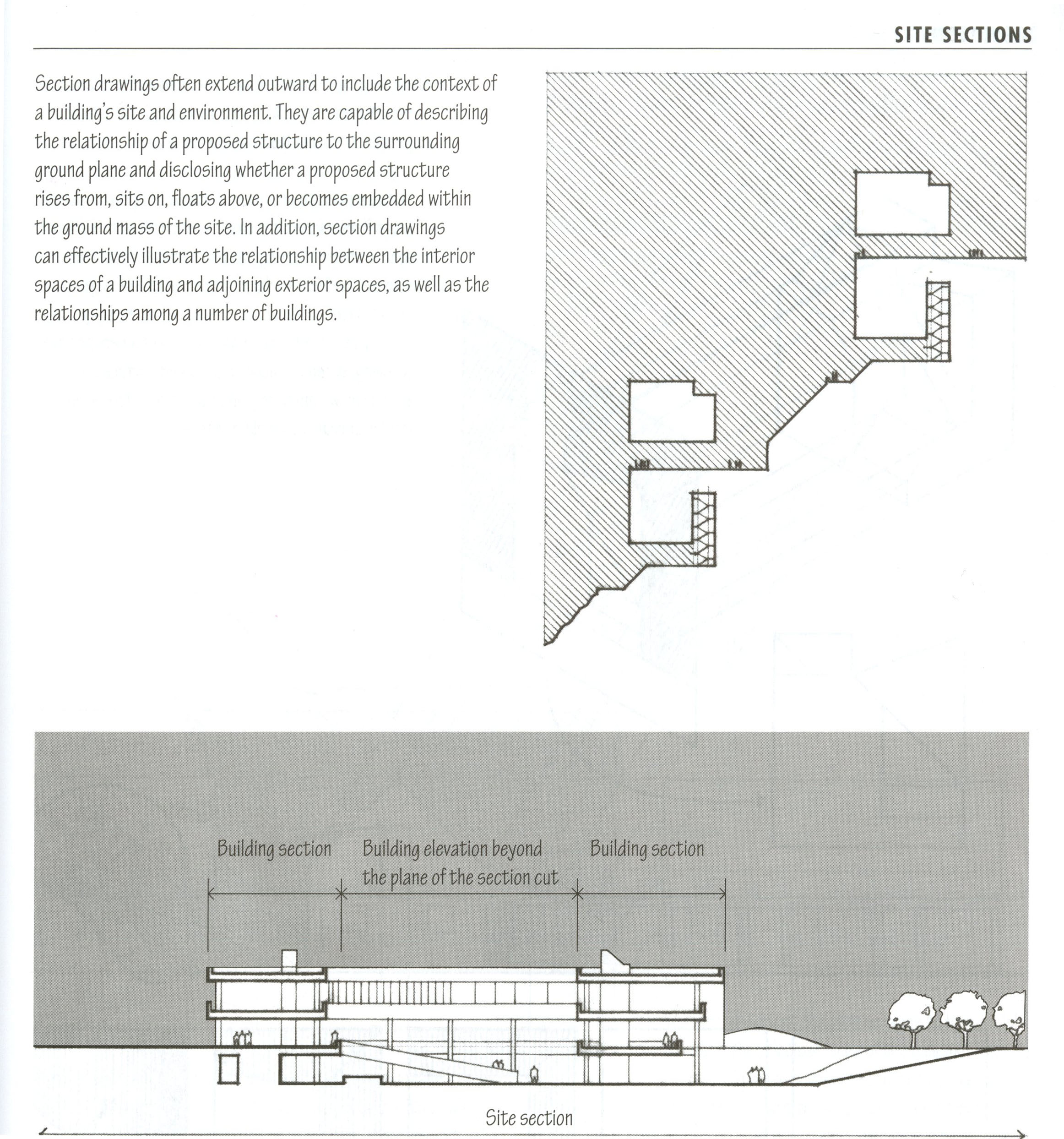 Another helpful drawing type to consider in representing the site would be a section perspective. This would be a section through the site but viewed in Perspective . This way, some context of the depth of the site would be shown in the drawing. We will be practicing this type of drawing later in the semester when we produce a section perspective drawing of your building.