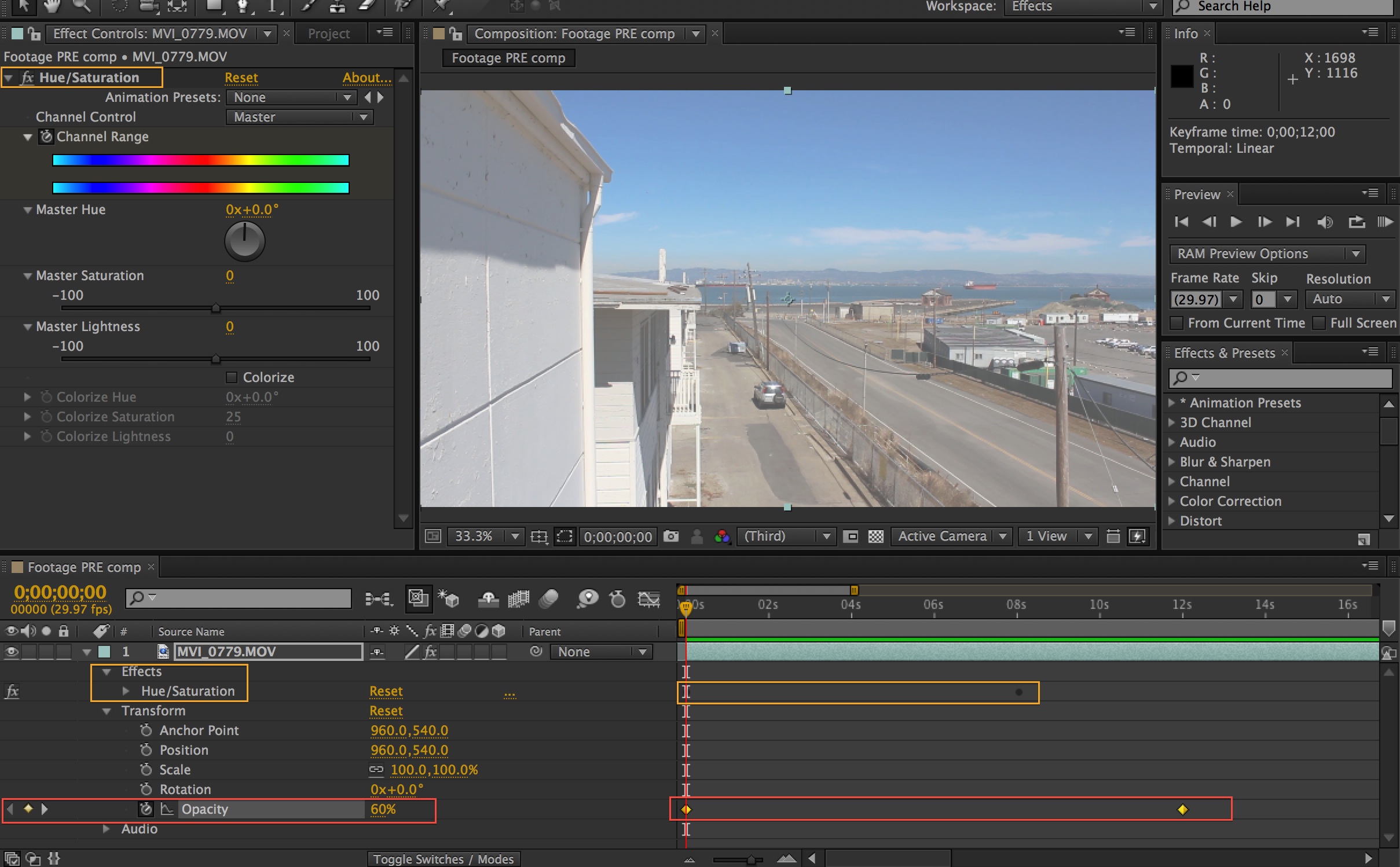 We will look at the basics of key framing through two simple effects applied to the .mov layer of the Footage PRE comp.