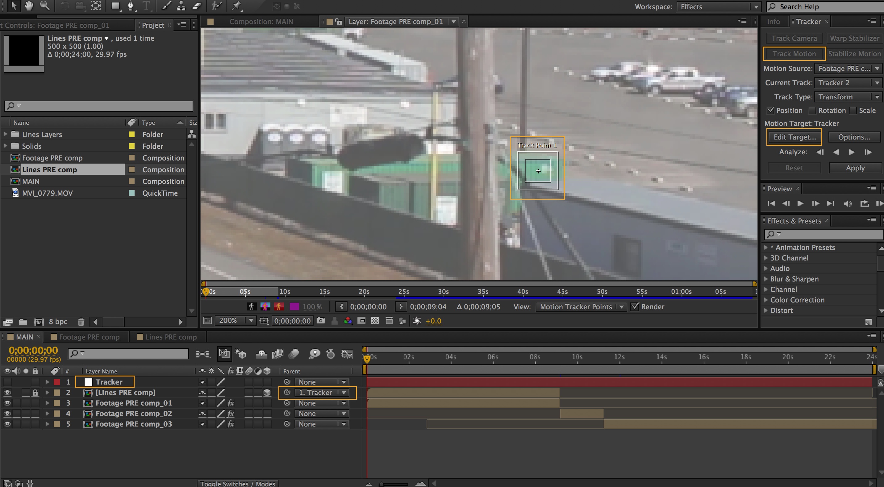 - Track Footage PRE comp. Window ->tracker . Make sure the Footage PRE comp layer is selected. Click track motion .