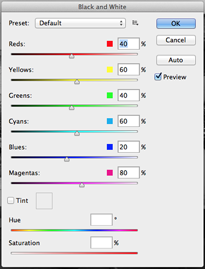 Maybe one of my favorites, the Black & White adjustment allows you to create quick and beautiful grayscale images. Add this filter by clicking on the B/W icon on the Adjustments Panel. This filter allows you to maintain full control over how individual colors are converted. Select the Default mode to create an automatic black and white image, or chose one of the many presets. Click on the auto Button to automate the adjustment. Besides you can mark the Tint checkbox and colorize the grayscale image.
