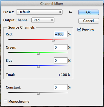 This Adjustment makes it easy to create high quality tinted or grayscale images. Add it by clicking the Channel Mixer icon in the Adjustments Panel. On the Adjustment Panel, select an Output channel as shown in the image 10.1 below. You’ll see the slider associated to the selected channel is 100%, then you can modify the color values by using the sliders (see 10.2).