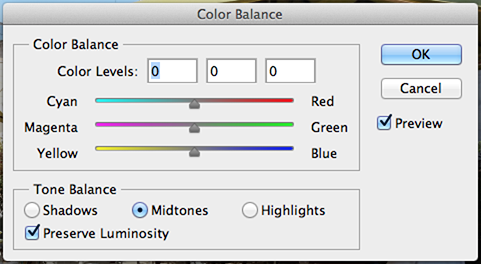 This adjustment changes the overall mixture of colors in an image for generalized color correction. It basically adds something like a tint over the Shadows, Midtones and Highlights of the image. Image>Adjustments>Color Balance