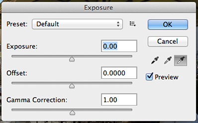 Exposure adjusts the exposure levels by adjusting three sliders: Exposure, Offset and Gamma. Exposure will adjust the highlights of the image without effecting the dark shadows. Offset will adjust the midtones and Gamma will adjust the dark tones without modify the highlights. Image>Adjustments>Exposure