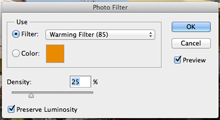 This Adjustment is just like if you put a color filter in front of the camera lens. Add it by clicking on the Photo filter icon in the Adjustment Panel. The are are several presets based on standards (see 9.1 below), increase/decrease the filter’s density to adjust the color intensity. Image 9.2 shows a warming filter by using an orange tone, and 9.3 shows a cooling filter by using a blue tone. You can easily customize a color filter by selecting the color radio button and selecting a color from Photoshop’s color picker.