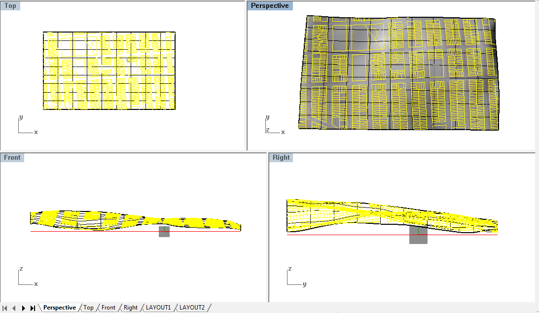 To make a large site model in a much faster manner, you can easily divide the city blocks with other collegues to divide and conquer the modeling tasks. To do this, use the ExportSelected command to export different city blocks. Or share the same original file with all the ground surfaces created (all the steps previous to Extruding the building).