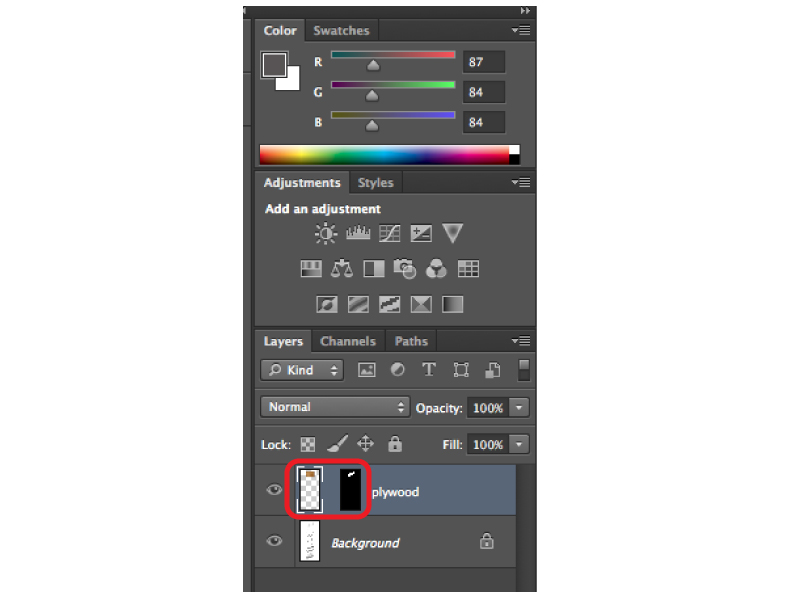 Activate the wood texture layer and select the "Add Vector Mask" button from the bottom of the LAYERS PANEL.