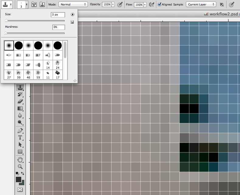 After you select the CLONE STAMP TOOL, zoom into one of our two areas to be corrected. A circle will be visible. This circle indicates the area that the CLONE STAMP TOOL will sample. Because we are working within a tight space we will need to select a smaller sample size. To do so open the BRUSH PANEL on the top left icon from the options menu bar. Here different BRUSH sizes and types can be selected.