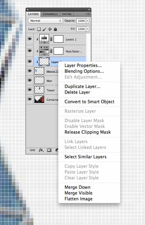 First, it is important to merge the new layer that we just created with the existing Hearst Tower Layer. This will prevent any confusion as we work on cleaning up the different parts of the tower's surface. To merge these two layers, from the LAYERS PANEL, right click on the new pasted layer and select MERGE DOWN.