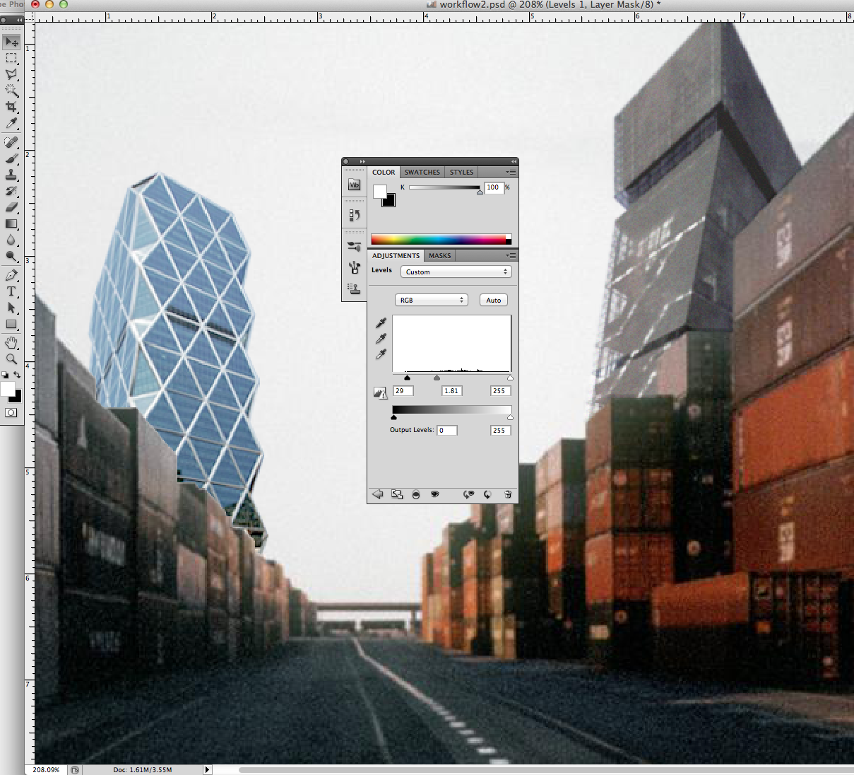 From the ADJUSTMENT LAYERS menu another useful tool is LEVELS. Here we can adjust brightness, contrast, and tonal range by specifying the location of complete black, complete white, and midtones in a histogram. By adjusting these respective sliders (and isolating the Hearst Tower Layer below) we can begin to adjust the Hearst Tower to seamlessly integrate with the landscape.